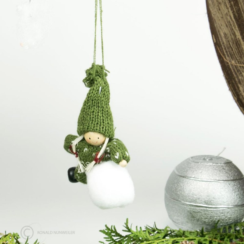 Stoffpuppe mit Schneeball auf Bauch - gruen H8cm